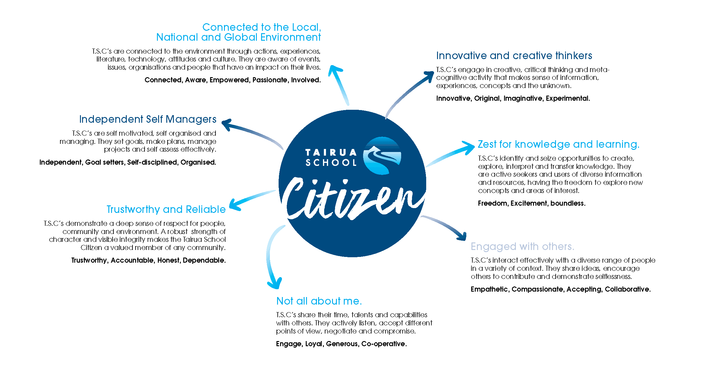 Our Citizen profile, developed in partnership with our students and wider community, underpins everything we do at Tairua School. It defines our shared goals and aspirations for all students, management and staff and is ingrained throughout our policies and curriculum.